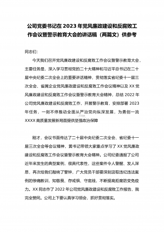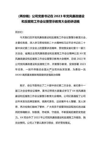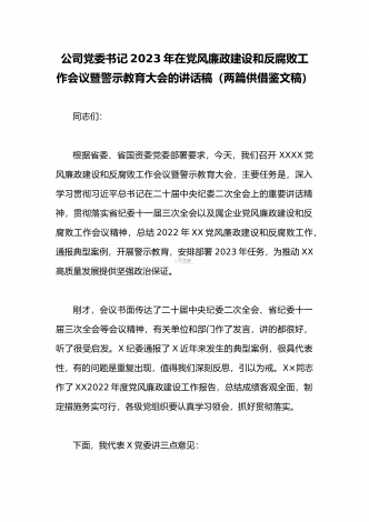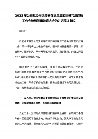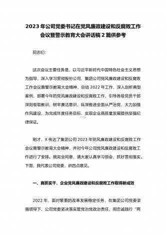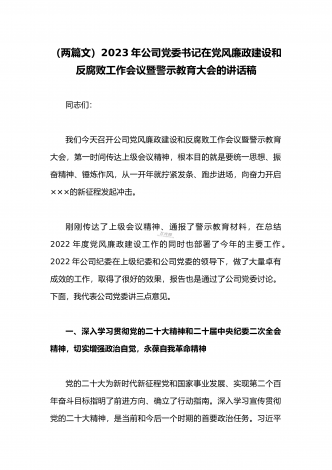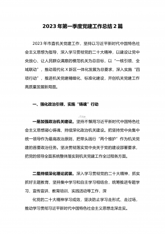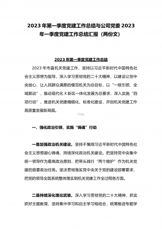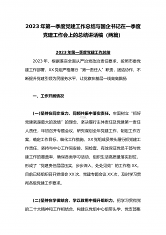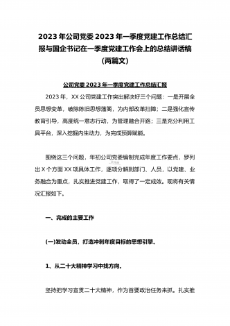 2023年公司党委2023年一季度党建工作总结汇报与国企书记在一季度党建工作会上的总结讲话稿(两篇文)