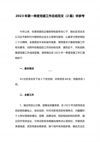 2023年公司党委2023年一季度党建工作总结汇报与国企书记在一季度党建工作会上的总结讲话稿(两篇文)公司党委2023年一季度党建工作总结汇报2023年,XX公司党建工作突出解决好三个问题:一是开展全员思想变革,破除陈旧思想藩篱,为内部改革扫障;二是强化宣传教育引导,高度统一意志行动,为管理融合开路;三是充分利用工具平台,深入挖掘内生动力,为完成预算赋能。围绕这三个问题,年初公司党委编制完成年度工作要点,罗列出X个方面XX项具体工作,逐项分解到部门、人员,以党建、业务融合为重点,扎实推进党建工作...