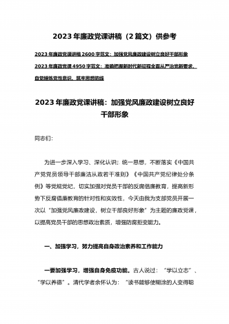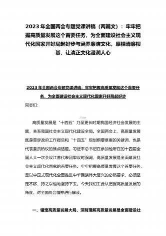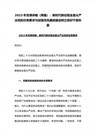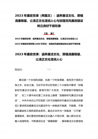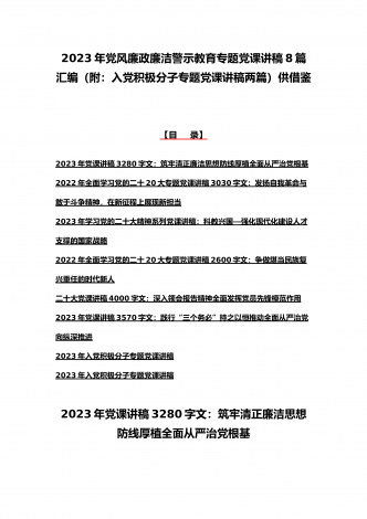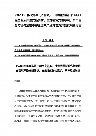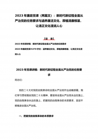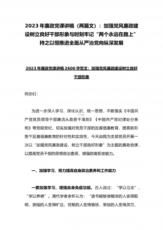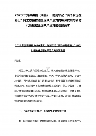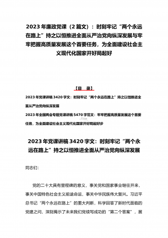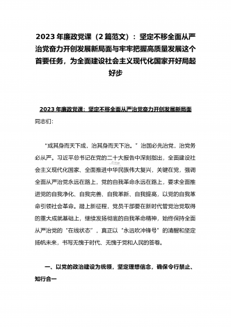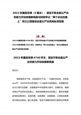 2023年廉政党课(2篇文):时刻牢记“两个永远在路上”持之以恒推进全面从严治党向纵深发展与牢牢把握高质量发展这个首要任务,为全面建设社会主义现代化国家开好局起好【目录】2023年党课讲稿3420字文:时刻牢记“两个永远在路上”持之以恒推进全面从严治党向纵深发展2023年全国两会专题党课讲稿5470字范文:牢牢把握高质量发展这个首要任务,为全面建设社会主义现代化国家开好局起好步2023年党课讲稿3420字文:时刻牢记“两个永远在路上”持之以恒推进全面从严治党向纵深发展同志们:党的二十大具有里程碑...