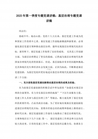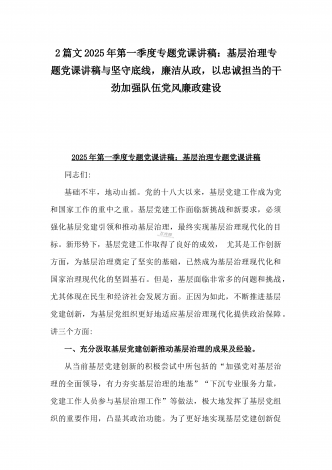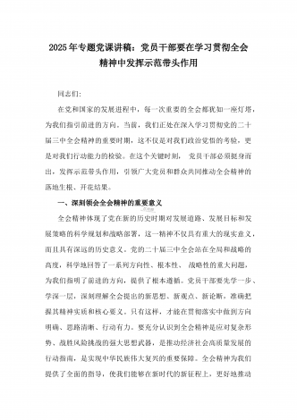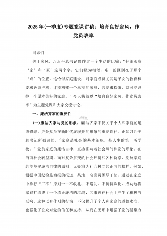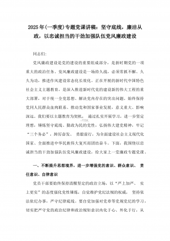2025年(第一季度)专题党课讲稿2篇:“大力弘扬宪法精神推动进一步全面深化改革”与“抓好党性、党风、党纪建设推动全面从严治党取得新成效”2025年(第一季度)专题党课讲稿:“大力弘扬宪法精神推动进一步全面深化改革”同志们:党的二十届三中全会指出:“必须全面贯彻实施宪法,维护宪法权威,协同推进立法、执法、司法、守法各环节改革,健全法律面前人人平等保障机制,弘扬社会主义法治精神,维护社会公平正义,全面推进国家各方面工作法治化。”宪法作为国家的根本大法,是治国安邦的总章程,具有最高的法律地位、法律权...