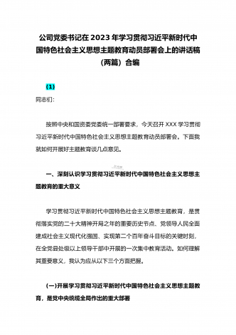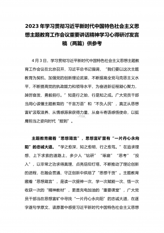 2023年学习贯彻习近平新时代中国特色社会主义思想主题教育工作会议重要讲话精神学习心得研讨发言稿(两篇)供参考4月3日,学习贯彻习近平新时代中国特色社会主义思想主题教育工作会议在北京召开,习近平总书记强调,“我们要以这次主题教育为契机,加强党的创新理论武装,不断提高全党马克思主义水平,不断提高党的执政能力和领导水平,为奋进新征程凝心聚力,踔厉奋发、勇毅前行。”知是行之始,行是知之成。广大党员干部当用心读懂主题教育的“千言万语”和“不负人民”,真正从思想富矿汲取滋养、从情感源泉获得力量、从奋斗寄语...