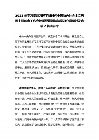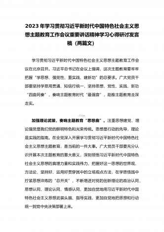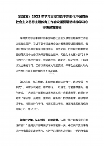 2023年学习贯彻习近平新时代中国特色社会主义思想主题教育工作会议重要讲话精神学习心得研讨发言稿(两篇)供参考