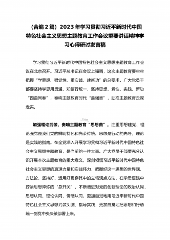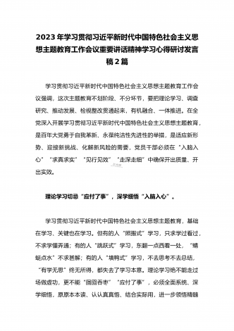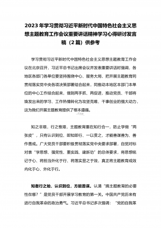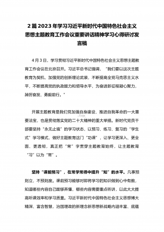 2023年学习贯彻习近平新时代中国特色社会主义思想主题教育工作会议重要讲话精神学习心得研讨发言稿(二份)供参考
