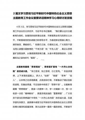 2023年学习贯彻习近平新时代中国特色社会主义思想主题教育工作会议重要讲话精神学习心得研讨发言稿(二份)供参考4月3日,学习贯彻习近平新时代中国特色社会主义思想主题教育工作会议在北京召开。习近平总书记强调,“我们要以这次主题教育为契机,加强党的创新理论武装,不断提高全党马克思主义水平,不断提高党的执政能力和领导水平,为奋进新征程凝心聚力,踔厉奋发、勇毅前行。”开展主题教育是我们党加强自身建设、推进自我革命的一大重要法宝,也是贯彻落实党的二十大精神的重大举措。新时代党员干部要坚持“永无止境”的学习...