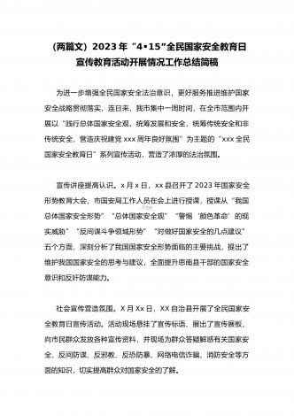 2023年“4•15”全民国家安全教育日宣传教育活动开展情况工作总结范文稿2篇合集(供参考)