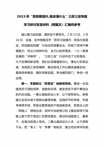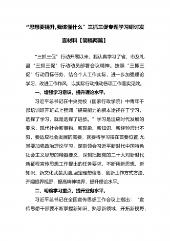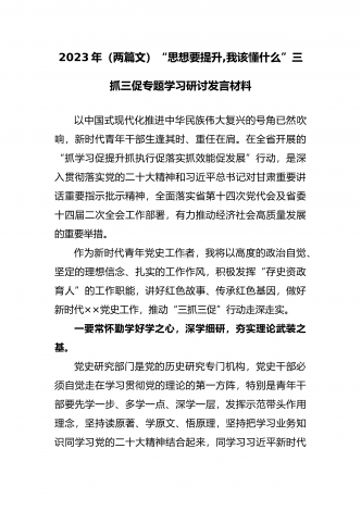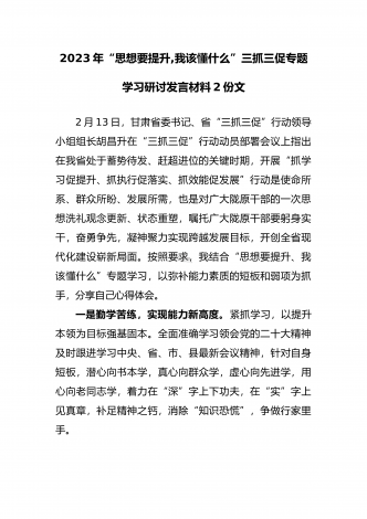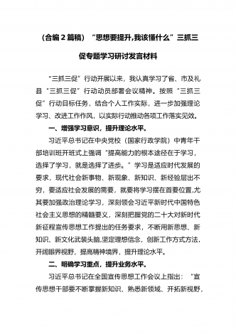 2023年“思想要提升,我该懂什么”三抓三促专题学习研讨发言材料(两篇文)汇编供参考