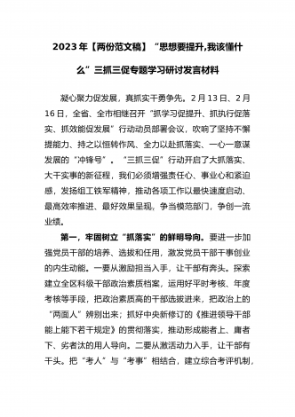 2023年“思想要提升,我该懂什么”三抓三促专题学习研讨发言材料(两篇文)汇编供参考凝心聚力促发展,真抓实干勇争先。2月13日、2月16日,全省、全市相继召开“抓学习促提升、抓执行促落实、抓效能促发展”行动动员部署会议,吹响了坚持不懈提能力、持之以恒转作风、全力以赴抓落实、一心一意谋发展的“冲锋号”。“三抓三促”行动开启了大抓落实、大干实事的新征程,我们必须增强责任心、事业心和紧迫感,发扬组工铁军精神,推动各项工作以最快速度启动、最高效率推进、最好效果呈现,争当模范部门,争创一流业绩。第一,牢固...