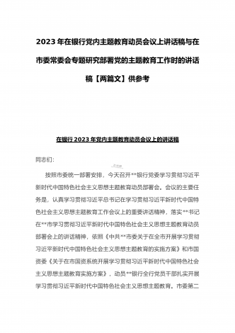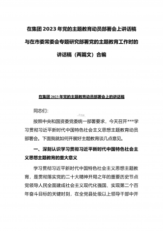 2023年在市委常委会专题研究部署党的主题教育工作时的讲话稿与纪检监察干部队伍教育整顿研讨发言稿【两篇文】供参考2023年在市委常委会专题研究部署党的主题教育工作时的讲话稿同志们:这次会议的主要任务是,以习近平新时代中国特色社会主义思想为指导,深入学习贯彻习近平总书记在中央学习贯彻习近平新时代中国特色社会主义思想主题教育工作会议上的重要讲话精神,对全市开展主题教育进行动员部署。根据市委常委会会议讨论精神,我讲四点意见。一、深入学习贯彻习近平总书记重要讲话精神,深刻领会开展主题教育的重大意义在全党...