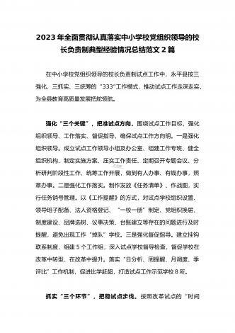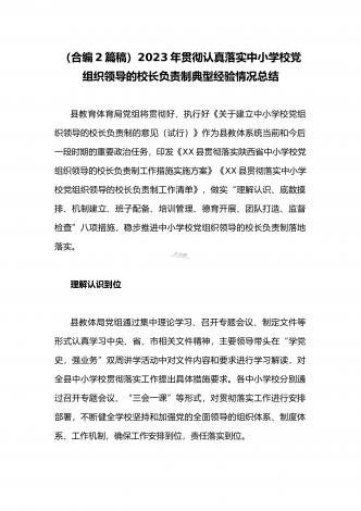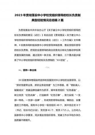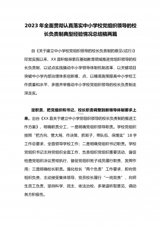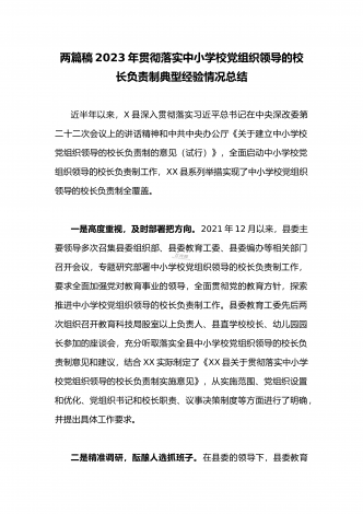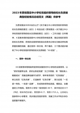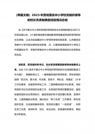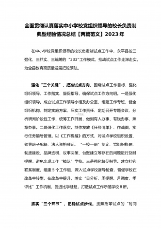 全面贯彻认真落实中小学校党组织领导的校长负责制典型经验情况总结【两篇范文】2023年