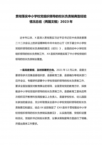 全面贯彻认真落实中小学校党组织领导的校长负责制典型经验情况总结【两篇范文】2023年在中小学校党组织领导的校长负责制试点工作中,永平县按三强化、三抓实、三统筹的“333”工作模式,推动试点工作走深走实,为全县教育高质量发展把舵领航。强化“三个关键”,把准试点方向。围绕试点工作目标,强化组织领导、工作落实、督促指导,确保试点工作方向明。一是强化组织领导。成立试点工作领导小组及办公室、组建工作专班、健全组织机构、制定实施方案、压实工作责任、定期召开专题会议、分析研判阶段性工作、统筹工作开展,做到有人...