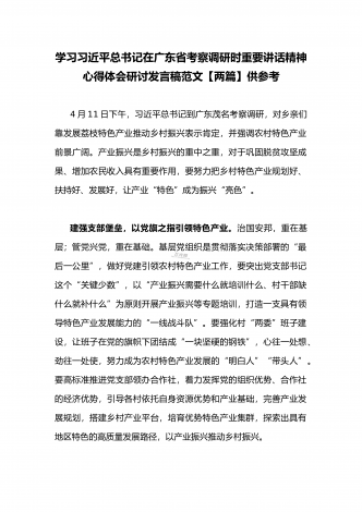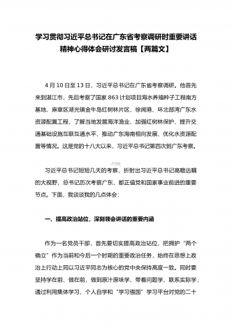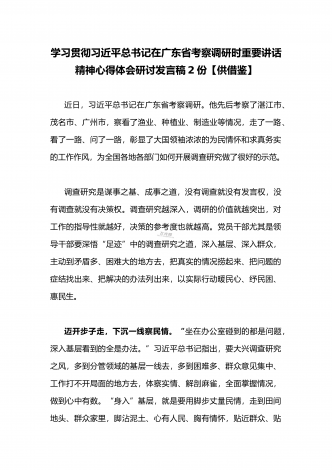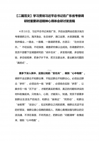 2023年全面贯彻认真学习习近平总书记在广东省考察调研时重要讲话精神心得体会研讨发言稿2篇【供参考】