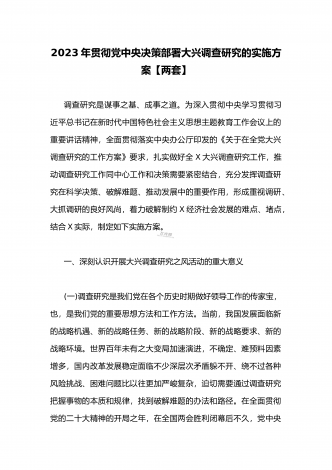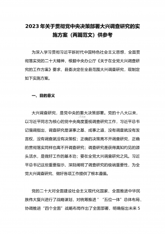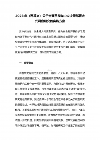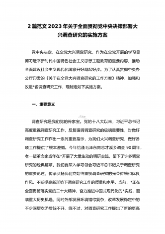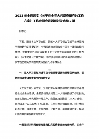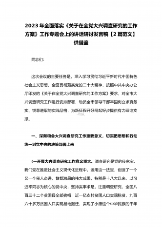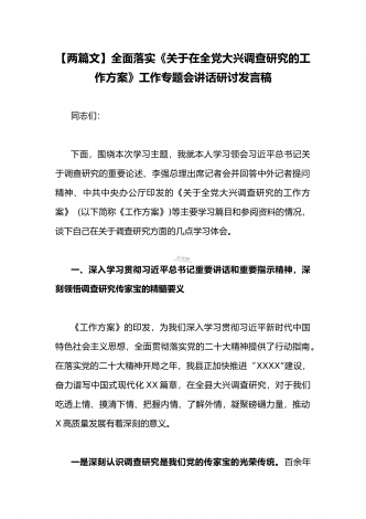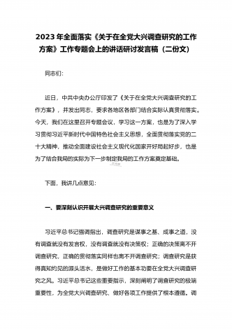 2023年全面落实《关于在全党大兴调查研究的工作方案》工作专题会上的讲话研讨发言稿【2篇范文】供借鉴同志们:这次会议的主要任务是,深入学习贯彻习近平新时代中国特色社会主义思想,全面贯彻落实党的二十大精神,按照中共中央办公厅印发的《关于在全党大兴调查研究的工作方案》要求,对全市大兴调查研究工作进行安排部署,动员全市领导干部牢固树立求真务实、锐意进取的实践品格,为新征程开好局起好步提供有力理论支撑。一、深刻领会大兴调查研究工作重要意义,切实把思想和行动统一到党中央的决策部署上来(一开展大兴调查研究工...