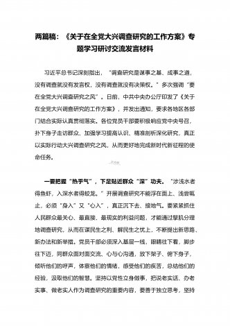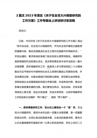 2023年全面落实《关于在全党大兴调查研究的工作方案》工作专题会上的讲话研讨发言稿【2篇范文】供借鉴