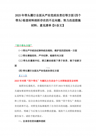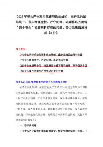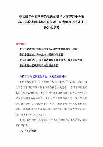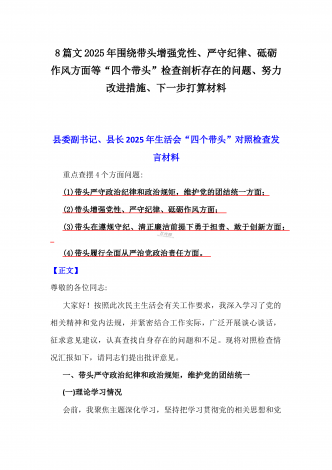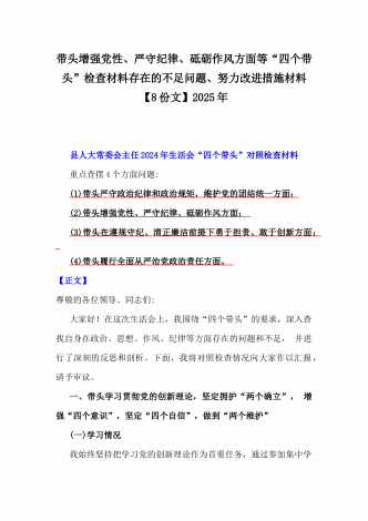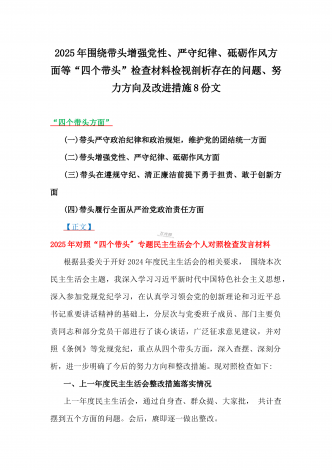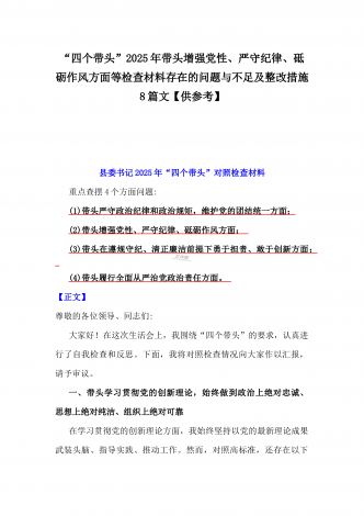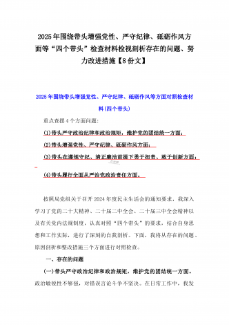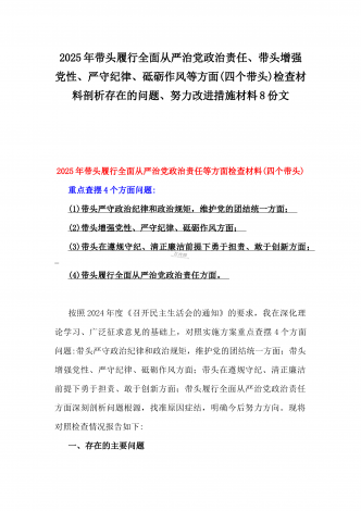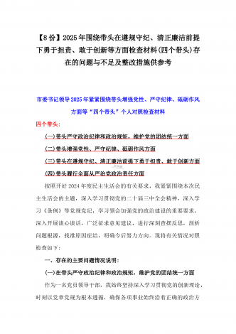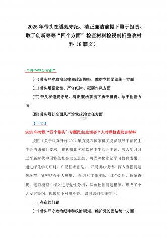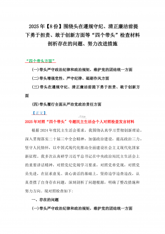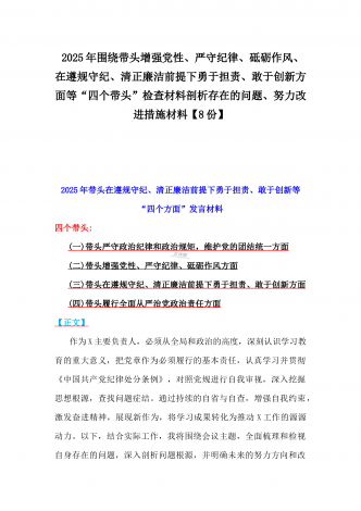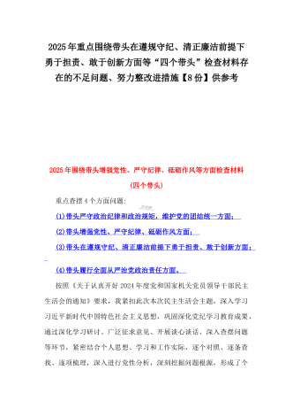 2025年围绕带头增强党性、严守纪律、砥砺作风、在遵规守纪、清正廉洁前提下勇于担责、敢于创新方面等“四个带头”检查材料剖析存在的问题、努力改进措施材料【8份】