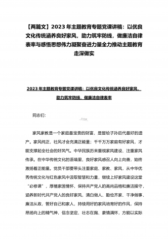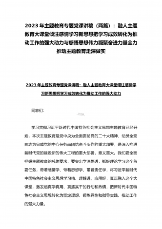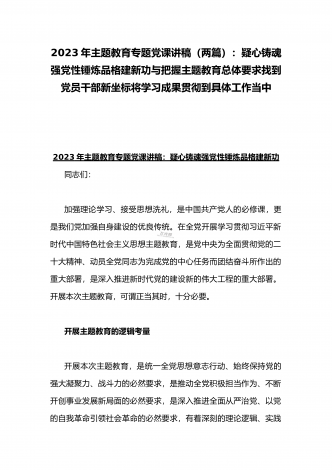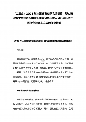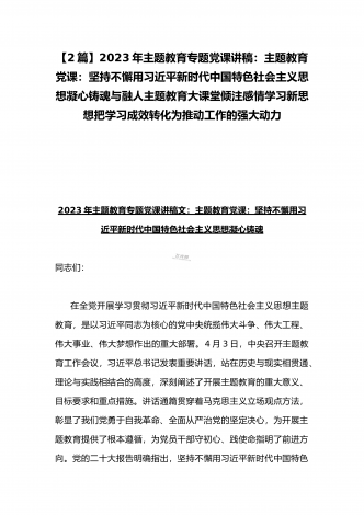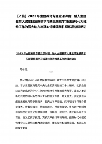 【2篇】2023年主题教育专题党课讲稿:主题教育党课:坚持不懈用习近平新时代中国特色社会主义思想凝心铸魂与融人主题教育大课堂倾注感情学习新思想把学习成效转化为推动工作的强大动力