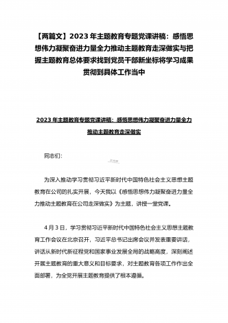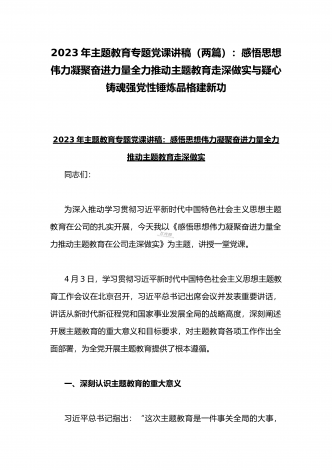 【2篇】2023年主题教育专题党课讲稿:主题教育党课:坚持不懈用习近平新时代中国特色社会主义思想凝心铸魂与融人主题教育大课堂倾注感情学习新思想把学习成效转化为推动工作的强大动力2023年主题教育专题党课讲稿文:主题教育党课:坚持不懈用习近平新时代中国特色社会主义思想凝心铸魂同志们:在全党开展学习贯彻习近平新时代中国特色社会主义思想主题教育,是以习近平同志为核心的党中央统揽伟大斗争、伟大工程、伟大事业、伟大梦想作出的重大部署。4月3日,中央召开主题教育工作会议,习近平总书记发表重要讲话,站在历史与...