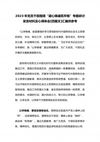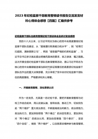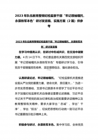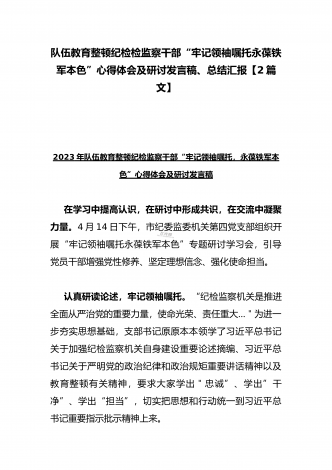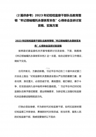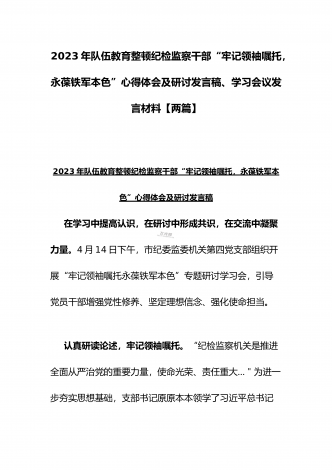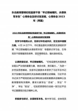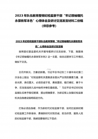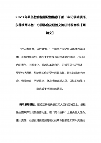 2023年队伍教育整顿纪检监察干部“牢记领袖嘱托,永葆铁军本色”心得体会及研讨发言稿、工作情况总结汇报、学习研讨发言材料[三篇文]2023年队伍教育整顿纪检监察干部“牢记领袖嘱托,永葆铁军本色”心得体会及研讨发言稿在学习中提高认识,在研讨中形成共识,在交流中凝聚力量。4月14日下午,市纪委监委机关第四党支部组织开展“牢记领袖嘱托永葆铁军本色”专题研讨学习会,引导党员干部增强党性修养、坚定理想信念、强化使命担当。认真研读论述,牢记领袖嘱托。“纪检监察机关是推进全面从严治党的重要力量,使命光荣、责任...