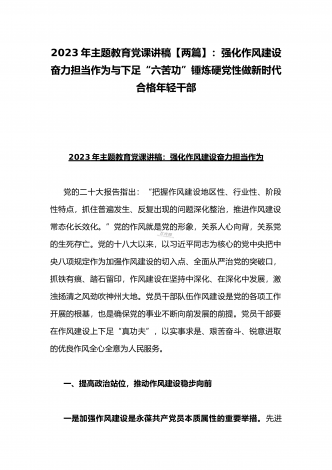 2023年主题教育党课讲稿【两篇】:强化作风建设奋力担当作为与下足“六苦功”锤炼硬党性做新时代合格年轻干部