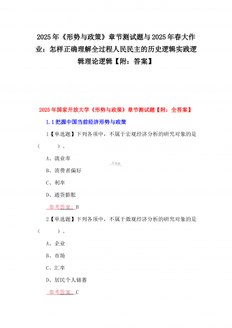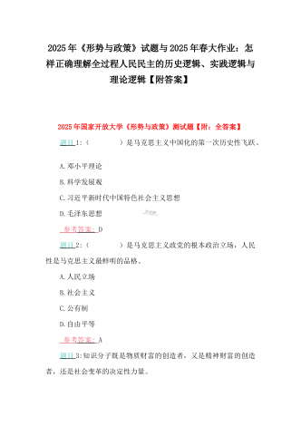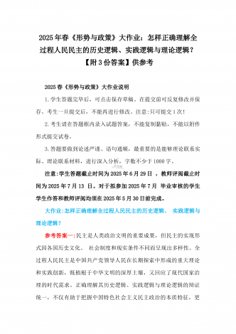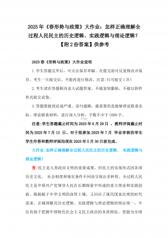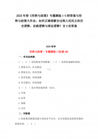 2025年春《形势与政策》专题测验1-5附答案与形势与政策大作业:如何正确理解全过程人民民主的历史逻辑、实践逻辑与理论逻辑?含2份答案