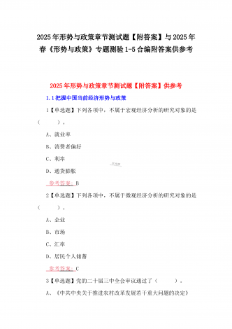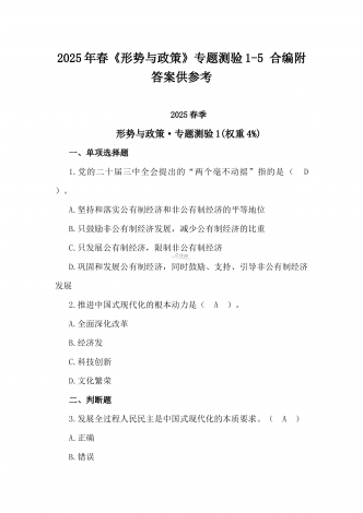2025年春《形势与政策》专题测验1-5附答案与形势与政策大作业:如何正确理解全过程人民民主的历史逻辑、实践逻辑与理论逻辑?含2份答案2025春季形势与政策·专题测验1(权重4%)一、单项选择题1.(A)是民族复兴的根基,(A)是国家强盛的前提。A.国家安全;社会稳定B.国家安全;经济发展C.经济发展;科技创新D.社会稳定;科技创新2.(C)是引领发展的第一动力。A.开放B.改革C.创新D.合作二、判断题3.高质量发展就是最大的高水平安全,安全发展是高质量发展的重要内容。(A)A.正确B.错误4...